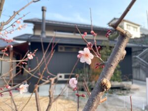 今朝、家を出る時に玄関先に植えてあるプラムの木に花が咲いているのを見つけました