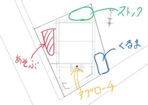 斜め配置にすることによって生まれるスペースにはそれぞれ、駐車スペースだったり、スタットレスや庭いじりの道具だったりのストックスペースなどそれぞれ役割が有ります
