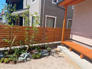 まだ遊び盛りのご家族が居るので、スペースを自由に使って遊んでもらいたく、植栽はあえて端っこに植えました