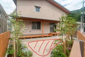 建物を境界に平行に配置するのではなく、斜めに建てることによって生まれる三角のスペース