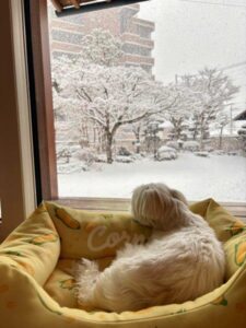 ウチの愛犬はぬくぬくとのんきに、雪景色を眺めています