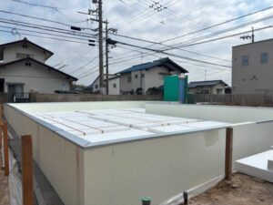 構造的により強くなるのはもちろんのこと、弊社は基礎の外側や底面をぐるっと断熱材で囲う、基礎外断熱工法を採用ているので、シロアリのリスクを1ミリでも減らすべく、施工が大変なことは百も承知で一体打ちを選択しております
