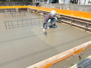 これは表面をきれいにするだけでなくコンクリートをこてで押さえて余分な水分を抜きながら圧密させていく大切な作業