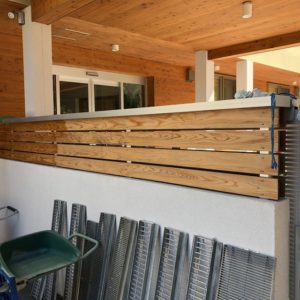 何やら早く終わりそうで、塗料も余っていたので、玄関ポーチの木部を塗装