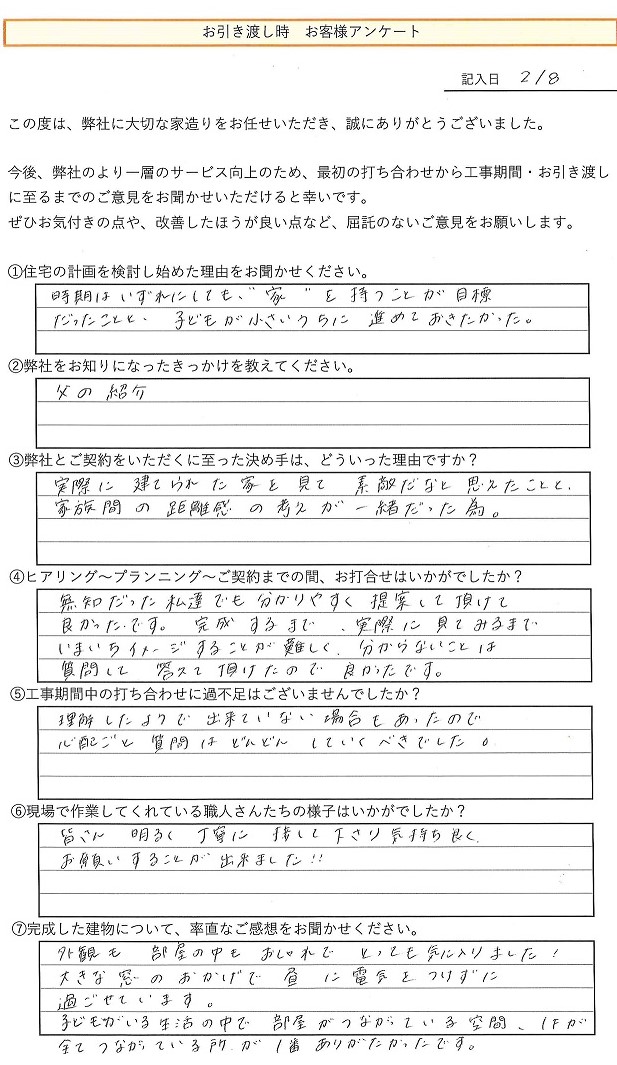 お客様の声190208 2019.02.28 嬉し声をいただきました 先日引き渡した【城内の家】 『初心忘るべからず』 今の気持ちをしっかり肝に銘じ、愚直に家造りを行っていきます 原文そのまま 嬉しい限りです