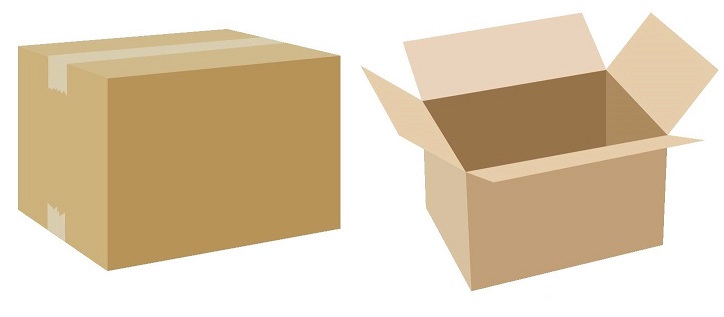 上下のフタを、しっかりガムテープで止めた段ボール箱と、フタを開けたままの箱