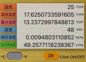 室温25℃・湿度48%・絶対湿度が0.0094kg、つまり9.4g。