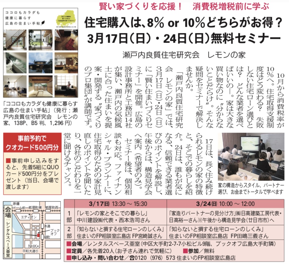 【FP相談室】及び【瀬戸内良質住宅研究会 レモンの家】と合同でセミナーと構造見学会を行います