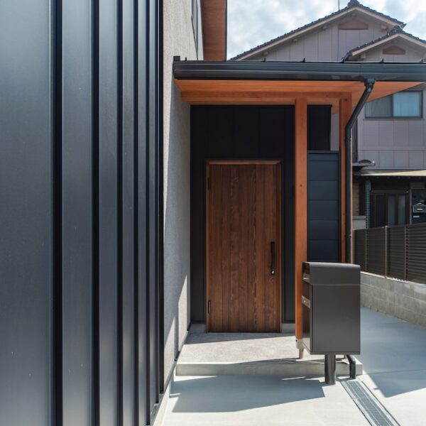 黒い板金の外壁素材と、白い漆喰の外壁素材 それに木製の玄関ドアや格子を合わせることで、やわらかな雰囲気に。南面が道路でも、視線を気にしなくていいように、吹きぬけから光をとりこみ、家中をを明るい空間に仕上げました。